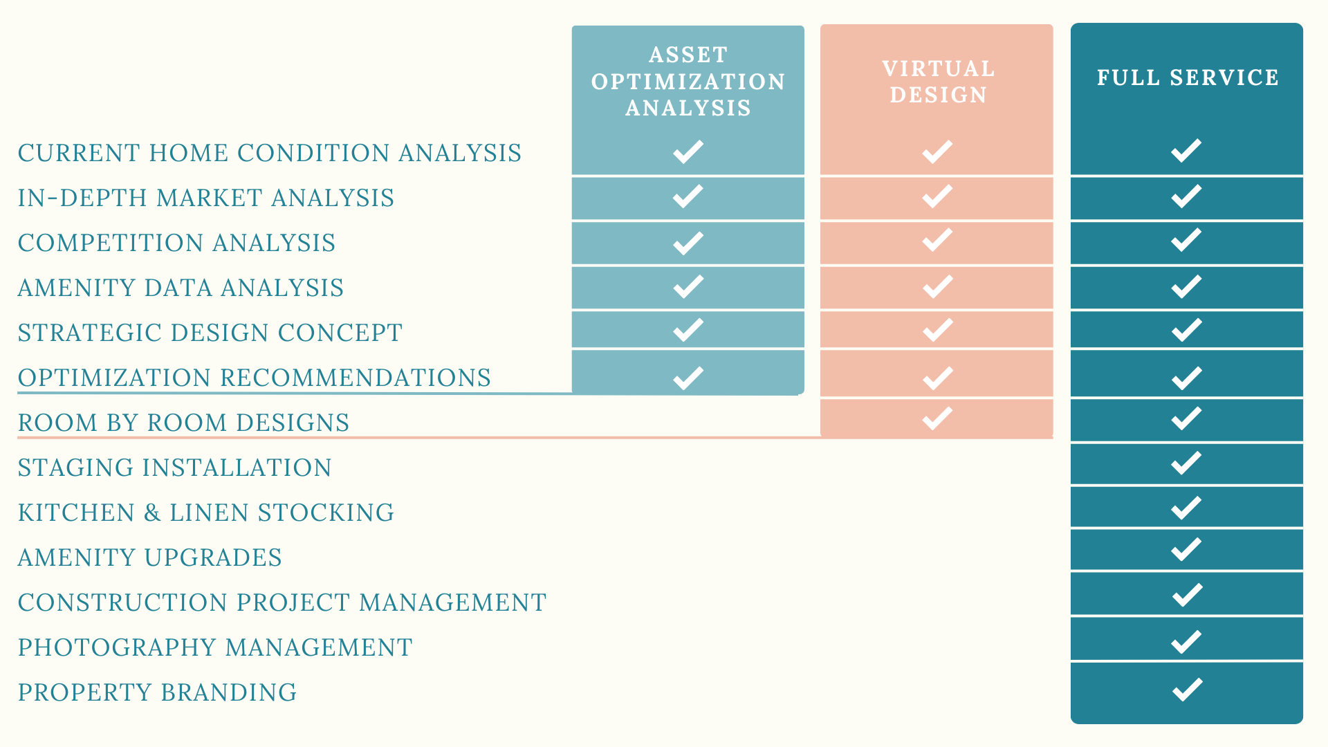 We handle everything from renovations to stocking and photography. Choose a fully hands-off experience or customize a plan with just the pieces you need.